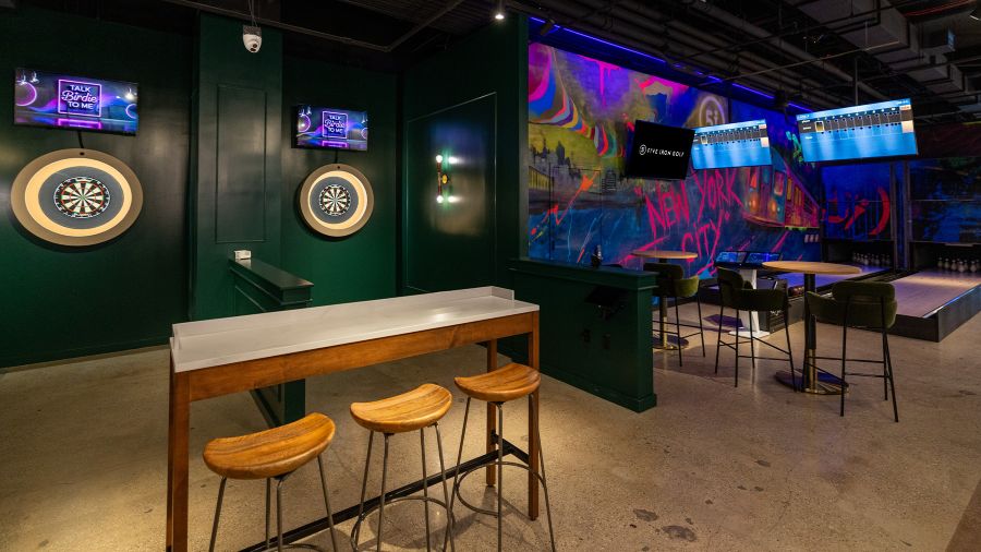 The design feels distinctly New York, shaped by a curated roster of leading artists, including Brooklyn-based Jason Naylor and DAIN, alongside New York graffiti artist SUCH and Blindfox, whose large-scale murals appear across Five Iron locations nationwide and have been recognized by The Boston Globe. Immersive murals, sculptural installations, and bold detailing create a multisensory environment across both floors that reflects the energy of Manhattan.