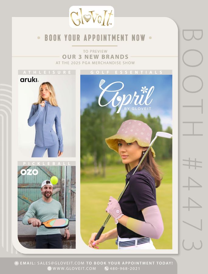 This year, Glove It will unveil three innovative new brands: April, a fresh take on golf fashion; OZO, tailored to pickleball players of all skill levels; and Aruki, versatile athleisure wear for active lifestyles.