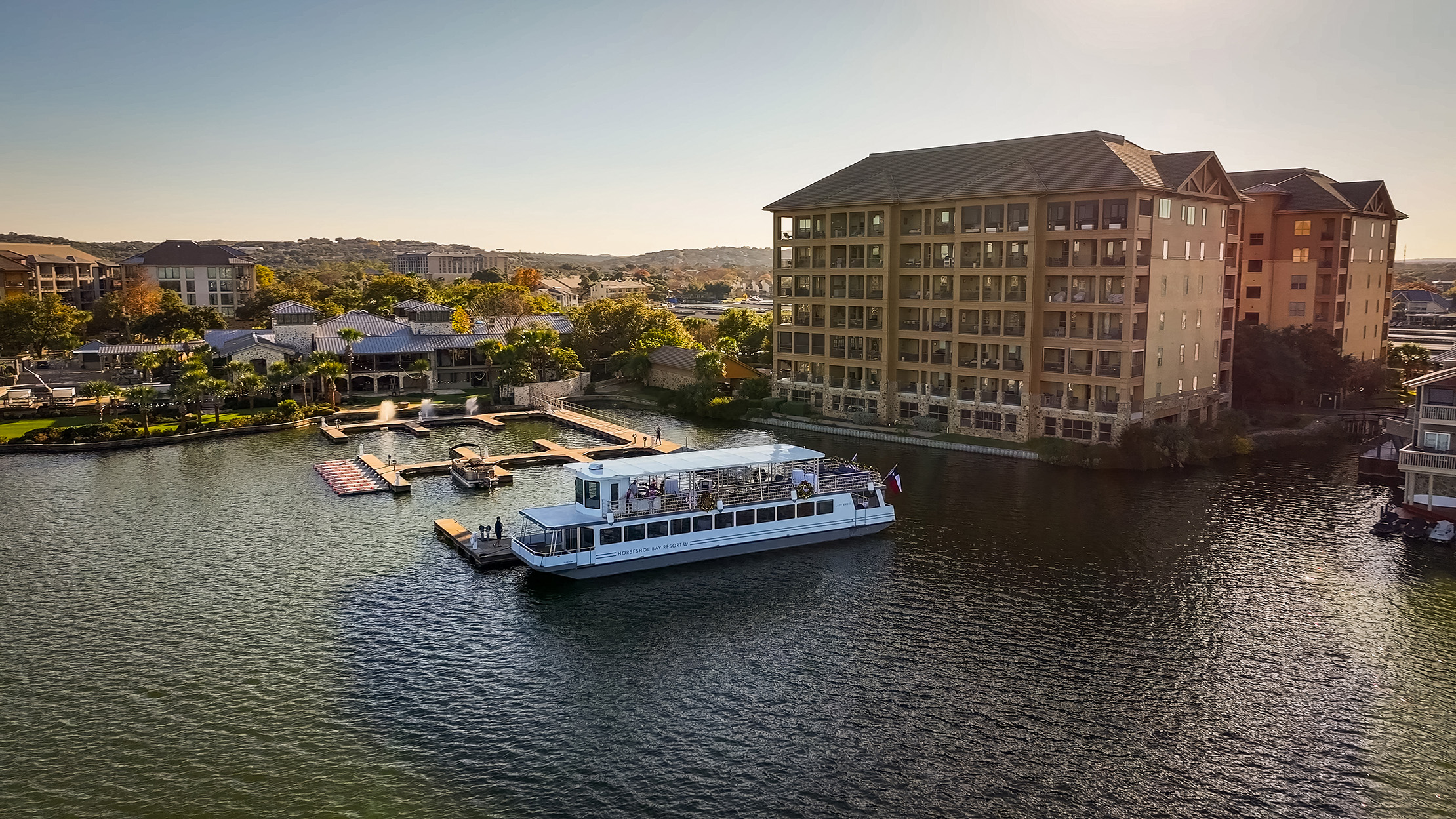 Horseshoe Bay Resort is located 45 minutes from Austin in the Texas Hill Country along the spectacular shores of constant-level Lake LBJ. Offering a range of new amenities, including scenic sunset cruises, a new fleet of Nautique luxury boats, and the highly anticipated seasonal return of the Waterfront Floating Pool and Splash Safari Aqua Park. With world-class golf and tennis, plus endless ways to experience Lake Lyndon B. Johnson, there is something for everyone.