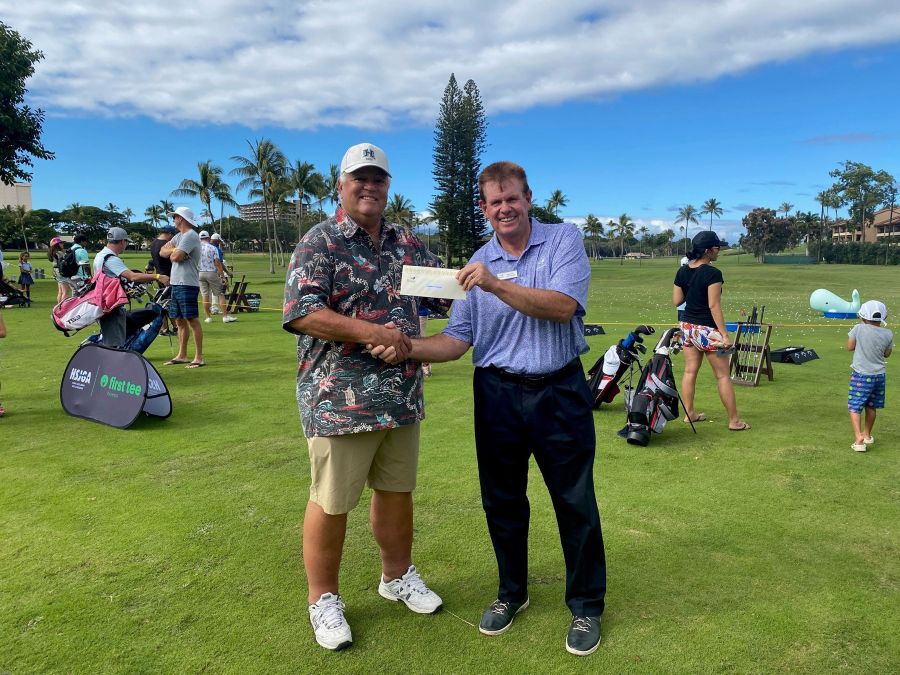 University of Hawai‘i Men’s Golf Coach, Scott Simpson (left) and Kā‘anapali GM, Karl Reul (right), shake hands after Kā‘anapali gifted $5,000 to UH during the 2023 Maui Junior Golf Kickoff.