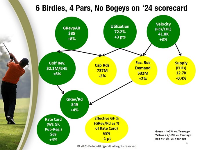 Pellucid & Edgehill Golf Advisors presented their 22nd consecutive annual State of the Industry (SoI) last week during the PGA Show to an in-person audience of nearly 100 and an additional ~50 online participants. Proving yet again that Pellucid/Edgehill aren’t “industry contrarians,” there was nary a red number in the wide-ranging, 90-minute review from Golf Revenue to the national weather impact figure of Capacity Rounds. The below image visualizes the key metrics “waterfall” designed by Pellucid and identifies those metrics achieving birdies (green) and pars (yellow). The SoI report quantifies each metric’s value and % change in the 70-slide PowerPoint deliverable:
