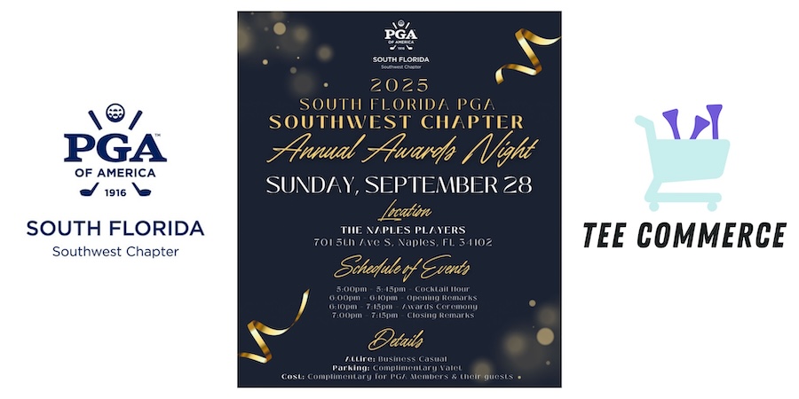 Tee Commerce is proud to join the South Florida PGA Southwest Chapter as title sponsor of its Annual Awards Night, taking place Sunday, September 28 at Naples Players Theater. This event welcomes PGA members and guests for cocktails, camaraderie, and a celebration of professional achievements.