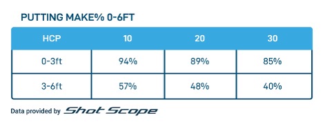 It all revolves around proximity. The difference between putts inside three feet and those from three to six feet is staggering. For the lower handicapper, the 10 handicap, the likelihood of holing their putt drops by just over a third from beyond three feet. For the average 20 handicapper, the likelihood drops from almost a dead certainty, 9 in 10, to roughly a 50/50 chance – a toss of a coin almost. For higher handicaps, they are twice as likely to hole from zero to three feet versus three to six feet (85 percent versus 40 percent). Although the drop off is significant, it should help with expectation management; putts from three to six feet are by no means a gimme, so don’t get frustrated if you aren’t holing them all.