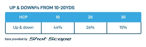When faced with the awkward distance of 10-20 yards and the decision of whether to pitch, chip, or try something creative, players have mixed success. In terms of up and down likelihood, the 10 handicap golfer is three times more likely to get up and down than the 30 handicapper.